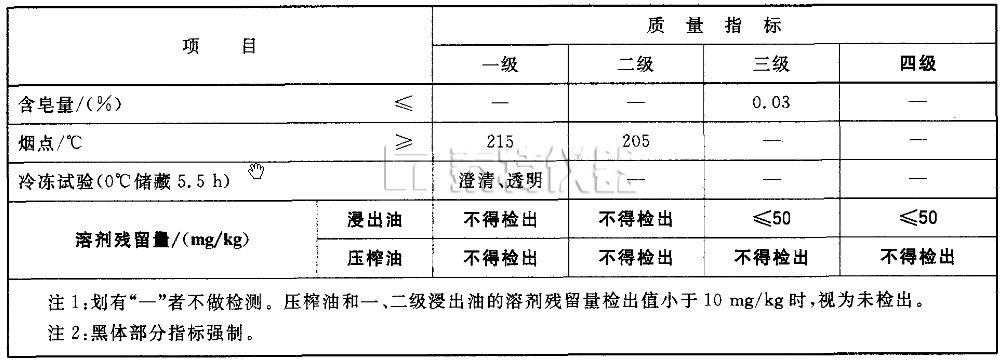 压榨成品大豆油、浸出成品大豆油质量指标:
